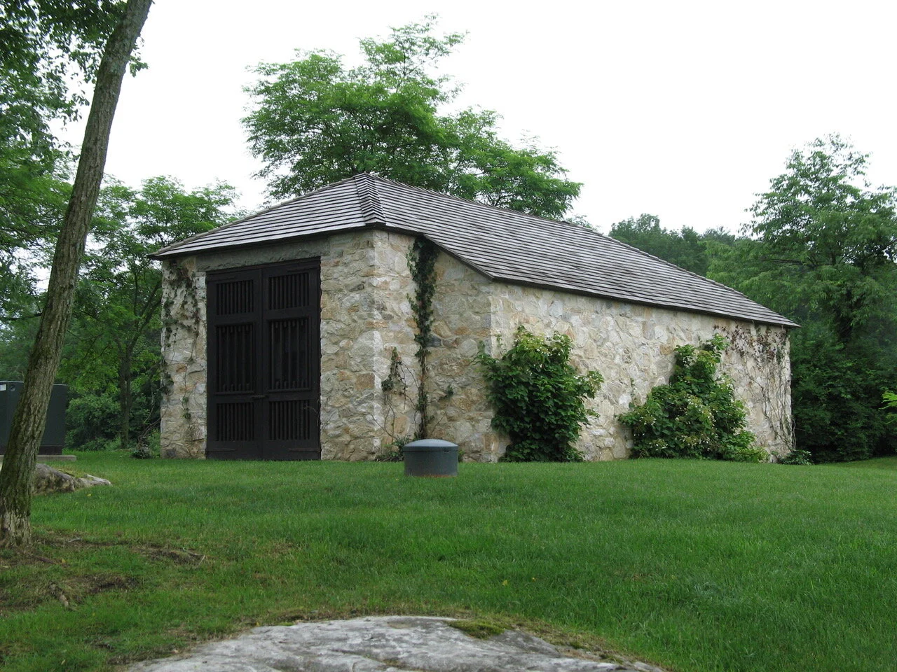 Weathered marble fieldstone, red slate, granite posts, oak and locust wood